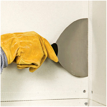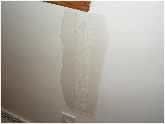 2、在墙面破损处贴上玻纤胶带,注意要全部覆盖住,然后把多余的胶带裁断。